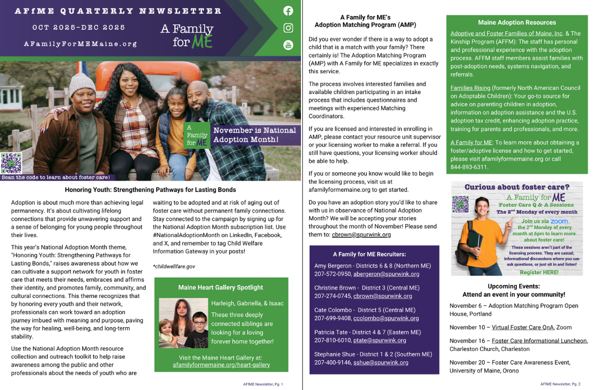 If you have an event you’d like us to attend, or your business or organization would like to host a Maine Heart Gallery Display, reach out to us at 1-844-893-6311 or email afamilyforme@spurwink.org.