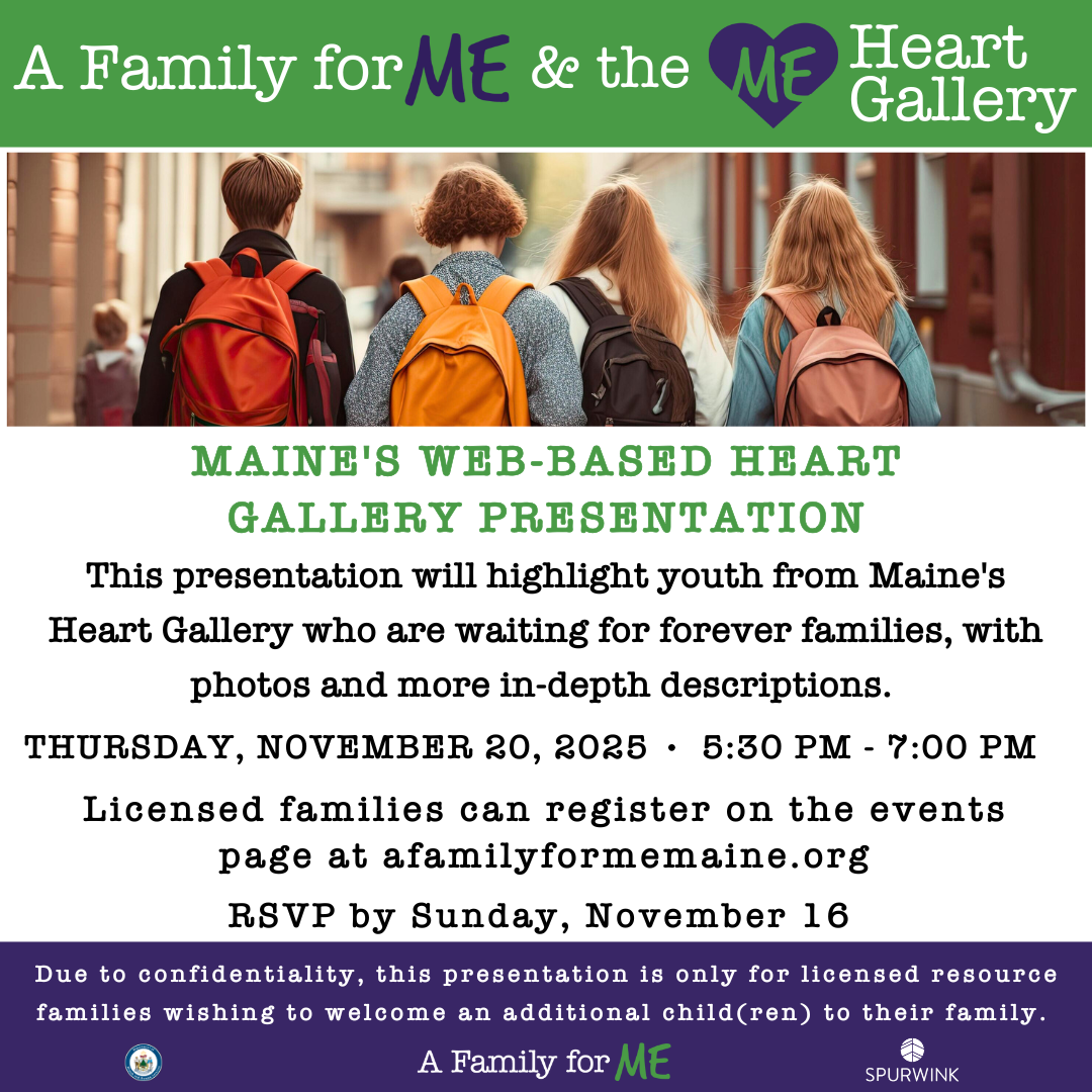 Licensed families are invited to attend our online Heart Gallery presentation! Learn about some of the children in Maine who are awaiting permanent homes!